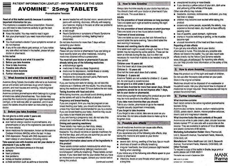 Avomine is a medicine that helps prevent, and helps to stop, travel sickness. Avomine blocks the messages to your brain from your ears and eyes that can confuse and cause feelings of nausea. Avomine may also be prescribed for giddiness or light-headedness.