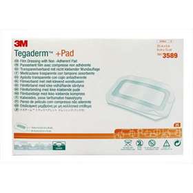 Tegaderm + Pad Film Single Dressing 9cm x 15cm (3589/3589E) is composed of a sterile, waterproof adhesive film with a central 4.5cm x 10cm non-adherent absorbent pad. This dressing provides a sterile, waterproof, viral and bacterial barrier to protect wounds as they heal.